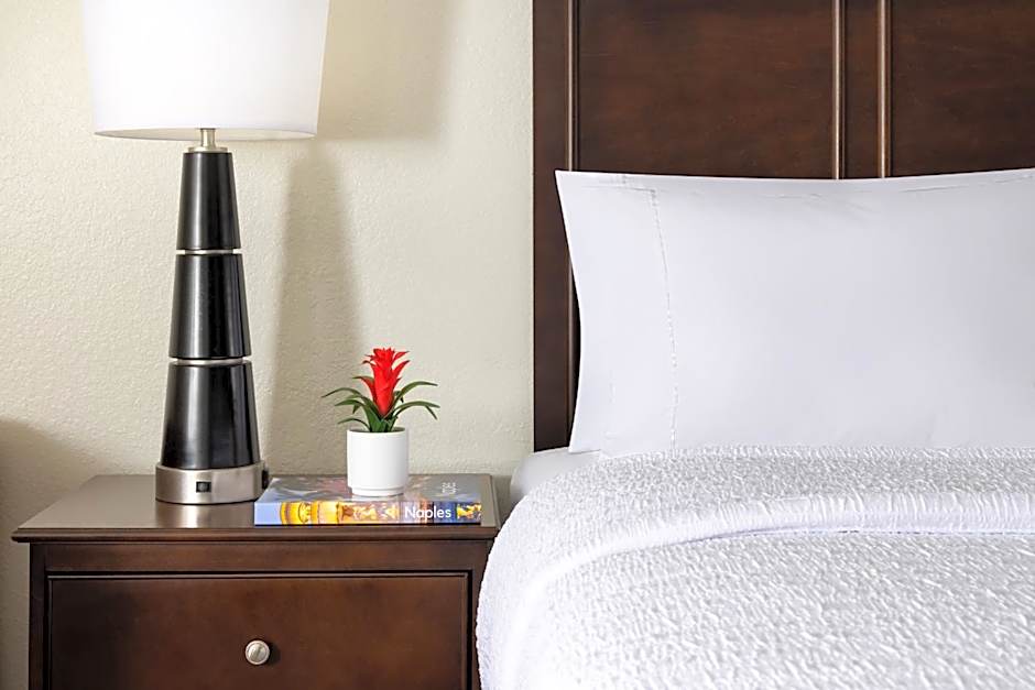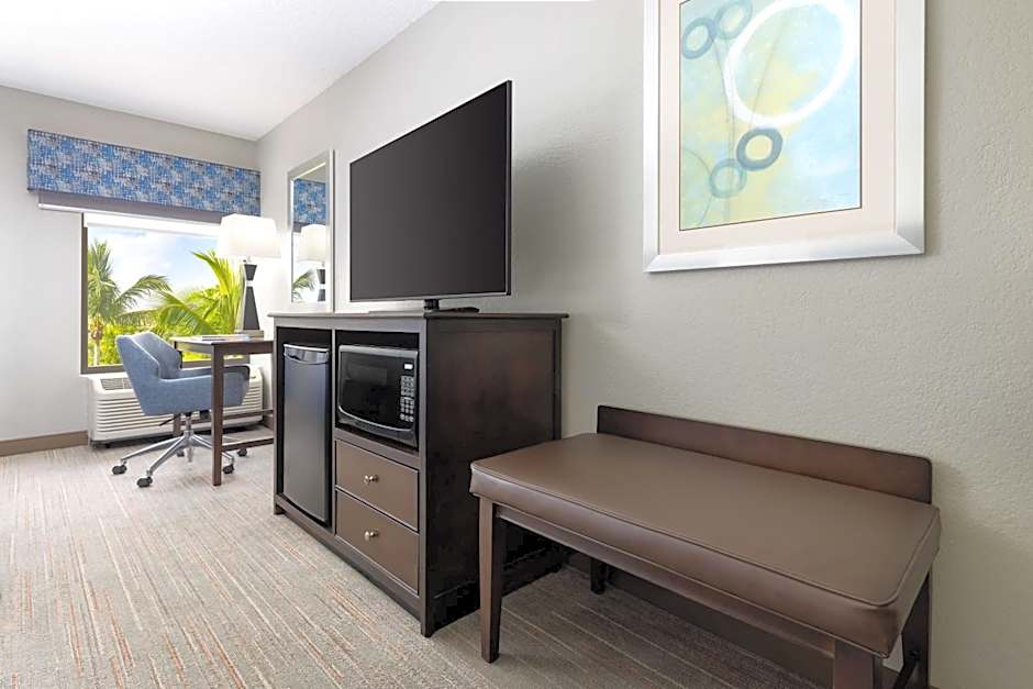 This room features a flat-screen cable TV, small refrigerator, and microwave.